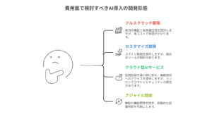 - SaaS/パッケージ型: 既にAIが組み込まれた既存ツール(CRM、会計ソフト等)を利用します。初期費用が安く、即座に利用を開始できるのがメリットです。