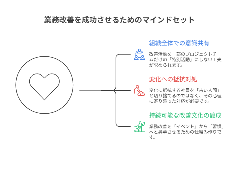 業務改善を成功させるためのエッセンスを改めて整理すると、以下の3点に集約されます。