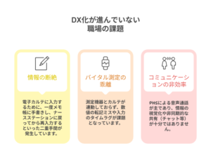 看護職の離職理由の多くは、過重な業務負荷にあります。DXによって解決すべき課題は以下の3点に集約されます。