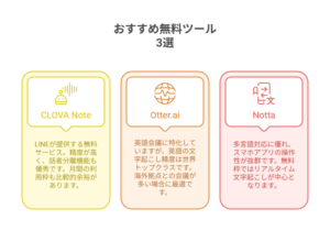 | CLOVA Note | iOS/Android/PC | 圧倒的な日本語精度と無料枠の広さ | 社内会議、インタビュー |
