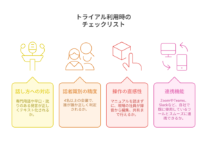 - 目的に合った精度と機能を選ぶ: 日本語重視なら国内ツール、グローバルなら多言語対応、手軽さならアプリ型など、現場のニーズに合致したサービスを選定すること。