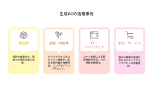 - IT・ソフトウェア: コード生成による開発期間の半減、バグ検知の自動化。