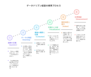 ステップ6:効果検証(Measurement) 施策を変えた結果、データがどう動いたかを再度確認します。このサイクルを高速で回すこと自体がデータドリブン経営の実践です。