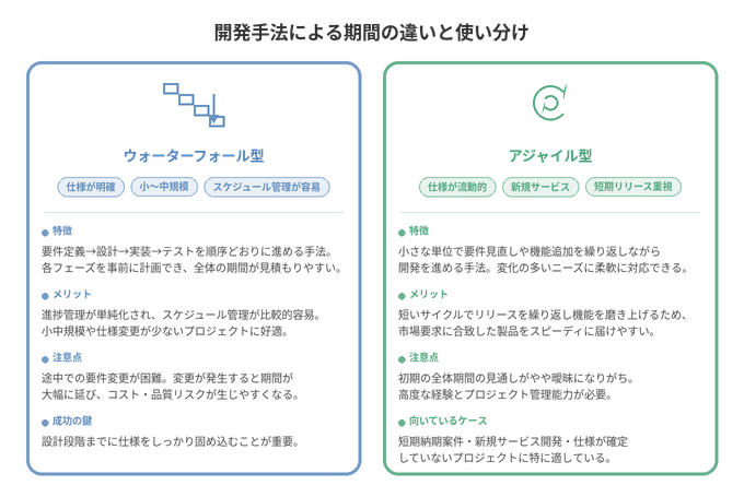 開発手法は期間の見通しや進行速度に大きく影響します。ウォーターフォール型とアジャイル型が二大柱であり、それぞれに適した活用法があります。